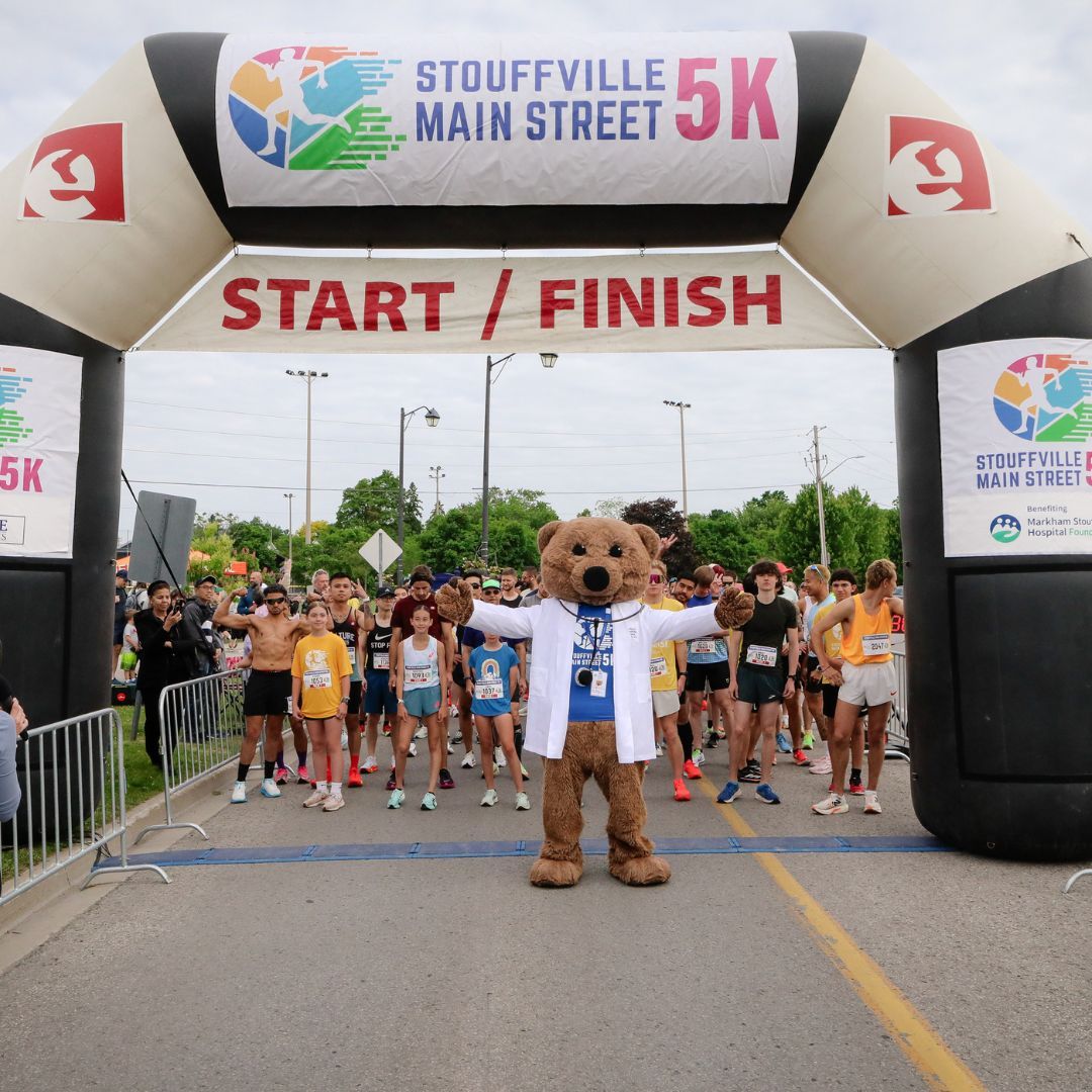 The Stouffville Main Street 5K and Kids 1K Dash event begins bright and early with the community coming together to sing our National Anthem followed by opening remarks, words of encouragement, and a cheque presentation to the Markham Stouffville Hospital Foundation. The 5K participants head down our Historic Main Street, while the younger kids dash around Memorial Park; all while having fun and raising money for our community hospital. This event is rounded out with many other activations including instructor led warm ups, water re-fill stations, post-race nourishment, post-race stretching and physio, a variety of photo-ops, family activities, and more.